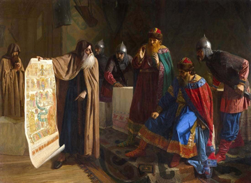 «Повесть временных лет» рассказывает, как за несколько лет до крещения Руси Владимир слушал представителей разных религий - и мусульман, и католиков, и иудеев, и наконец православных. В летописи даже приведено краткое содержание Священного Писания, пересказанное приехавшим из Византии греком в ответ на вопросы киевского князя, и история, как тот показывает правителю-язычнику изображение Страшного суда, на котором грешники идут на мучения, а праведники - в рай. «Если хочешь с праведниками стать, то крестись», - советует грек. «Владимиру же, - говорит летописец, - запало это в сердце, и сказал он: “Подожду еще немного”». Ещё год он размышлял, посылал «мужей славных и умных испытывать веру» и в мечети, и в католическом храме, но только из собора, находящегося в Царьграде, с патриаршего богослужения, те вернулись вдохновленными - не могли забыть красоты службы, на которой, по их словам, с людьми пребывал Сам Господь. И Владимир принял решение креститься, прислушавшись к совету своих приближенных: «Если бы плох был закон греческий, то не приняла бы его бабка твоя Ольга, а была она мудрейшей из всех людей».